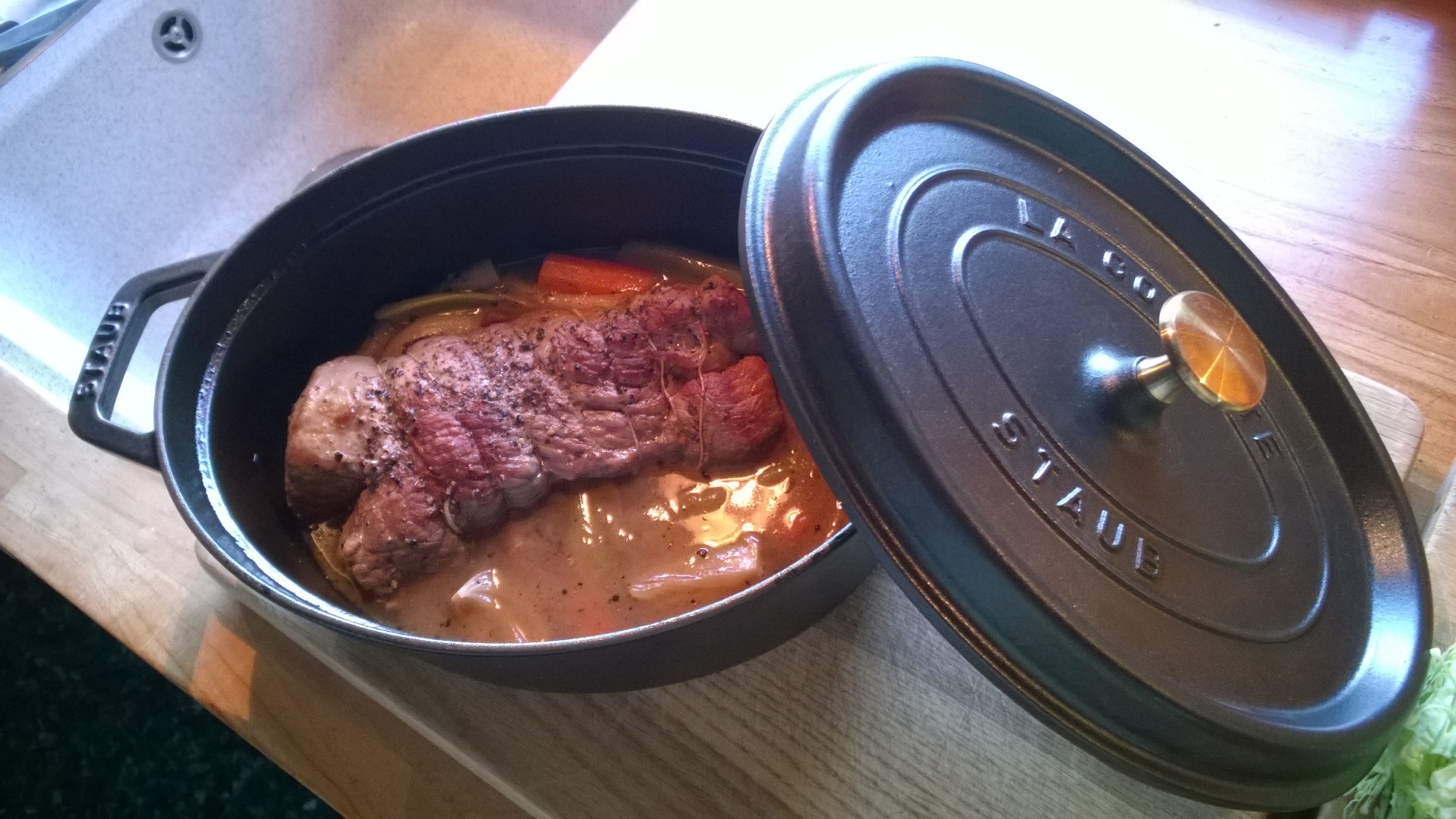 Lørdagsmenuen blev kalvesteg i cocotte … skøn sovs. Og nu slapper vi af i sofaerne med et glas rose til tonerne fra Tony Bennett og Lady Gaga … og Cosmo’s snorken.